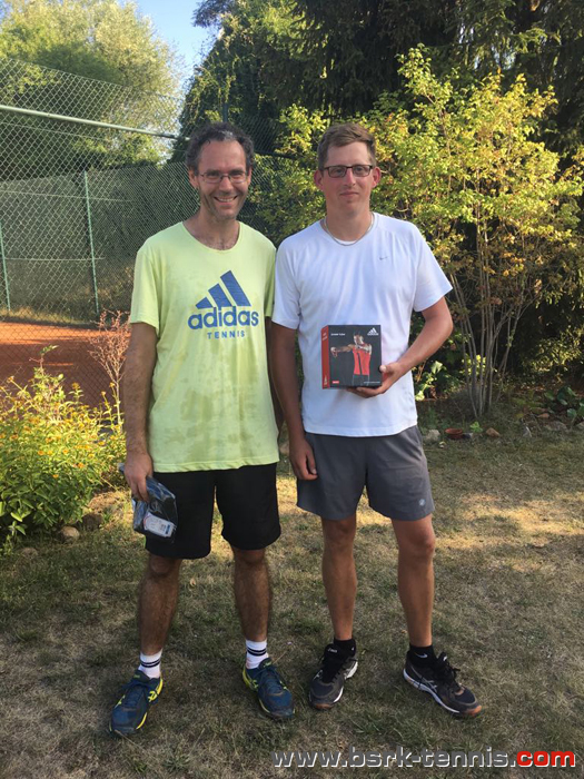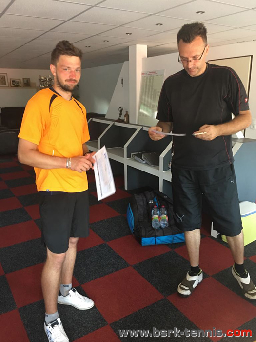 Im Spiel unseres BSRK’lers Krause zeigte sich schnell, dass sich seine besonders starke Vorhand auch bis zum Gegner herumgesprochen hatte. „Maxi“ spielte konsequent nahezu jeden Ball auf die Rückhand von Krause und übte damit extrem viel Druck aus um Fehler zu erzwingen. Krause versuchte aus diesen Ballwechseln heraus zu kommen und seinem Gegner ebenfalls auf die deutlich schwächere Rückhand zu spielen. Da dieser jedoch auch seinem dritten Match des Wochenendes noch so fit und schnell zu Fuß war, dass er jeden Ball umlaufen konnte um seine Vorhand Inside-out einzusetzen gelang es Krause nur selten auf diese Weise zu punkten. Da sich zusätzlich auf beiden Seiten ab und zu leicht vermeidbare Fehler einschlichen und Krause in der Lage war viele druckvolle Bälle zu erlaufen und zurückzuspielen, entwickelte sich eine extrem ausgeglichene Partie. Nahezu jedes Aufschlagspiel fand seine Entscheidung erst über Einstand. Die entscheidenden Fehler unterliefen Krause im ersten Satz als er beim Stand von 5:4, 15:40 aus Sicht des Gegners nicht in der Lage war die Breakbälle zu nutzen und den Satz mit 6:4 verloren geben musste. Der zweite Satz verlief ähnlich wie der erste. Hierbei musste das Spiel jedoch mehrfach kurzzeitig unterbrochen werden da sich in dem parallel stattfindenden Halbfinale auf dem benachbarten Platz ein handfester Streit über verschiedene Entscheidungen (Aus/Linie) entwickelte der letztendlich auch zu einer Aufgabe führte. Die ständigen Diskussionen auf dem Nachbarplatz sorgten dafür, dass die Konzentration bei Krause und Gutt etwas verloren ging. Nichtsdestotrotz blieb es ein spannendes Match bei dem Krause versuchte alles aus sich heraus zu holen und den nun ständig an Netz vorrückenden Gutt mit Bällen zu konfrontieren die dieser nur schwer vollieren kann. Auf diese Weise gelang es ihm das frühe Break des zweiten Satzes zu revidieren und sich das Rebreak zum 4:4 zu holen. Erleichtert über das erste geschaffte Break seinerseits musste er jedoch mit ansehen, wie sein gegenüber davon völlig unbeeindruckt blieb und sich direkt das nächste Break sichern konnte, so dass auch der zweite Satz mit 6:4 an „Maxi“ Gutt ging.